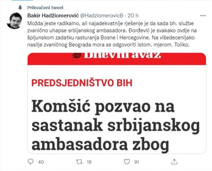 -Možda jeste radikalno, ali najadekvatnije rješenje je da sada bh. službe zvanično uhapse srbijanskog ambasadora. Đorđević je svakako ovdje na špijunskom zadatku rasturanja Bosne i Hercegovine. Na višedecenijsko nasilje zvaničnog Beograda mora se odgovoriti istom mjerom - napisao je Hadžiomerović.