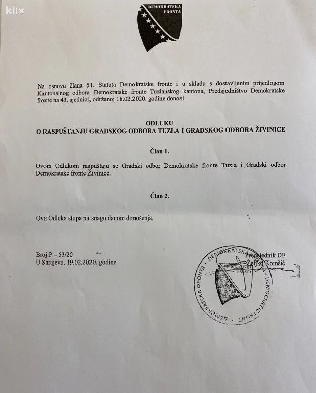 Također, donesena je i odluka o raspuštanju Gradskog odbora DF-a i Tuzli te Gradskog odbora DF-a u Živinicama. Zbog ovakvih odluka danas su konferenciju za medije održali sada već bivši rukovoditelji gradskih odbora Bahrudin Šarić i Esad Kitić, koji su iznijeli svoju stranu priče, ali i teške optužbe na račun vrha stranke u Tuzlanskom kantonu.