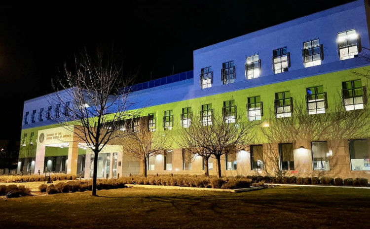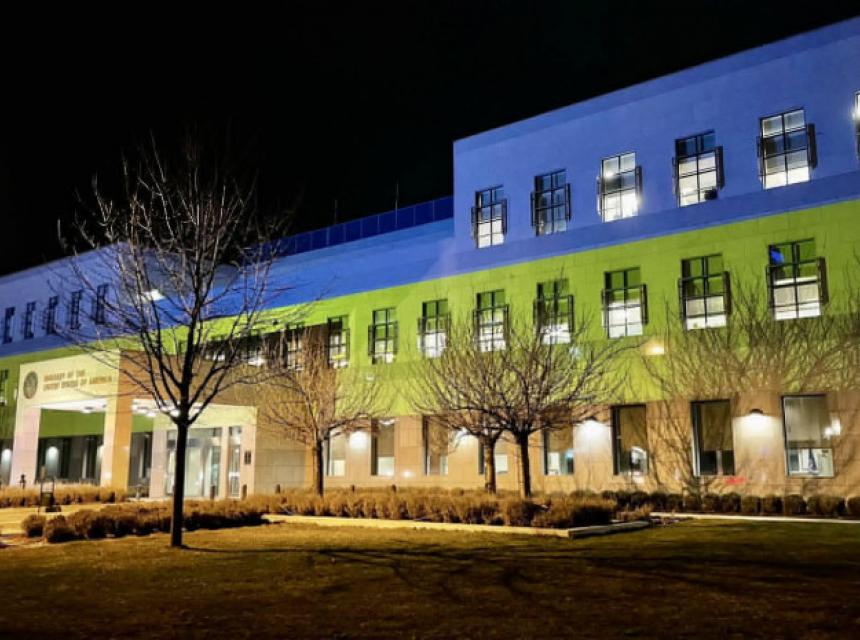 Boje ukrajinske zastave večeras u Sarajevu osvjetljavaju zgradu Ambasade Sjedinjenih Američkih Država u BiH.
