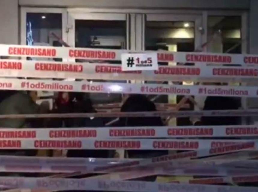 Oko ulaza u zgradu RTS-a postavljena je traka "Cenzurisano", a na platou te medijske kuće upaljene su baklje i postavljen veliki transparent "Gotov je".