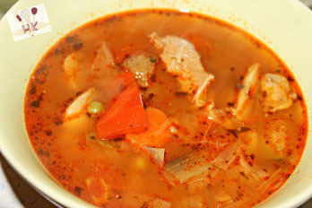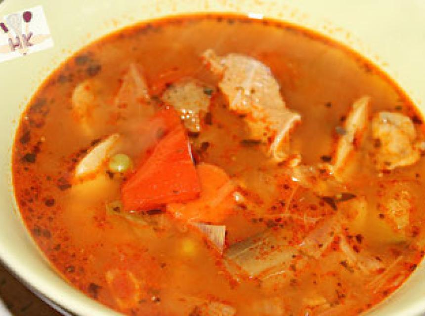 Kad corba prokuha, dodajte kocku za supu i bijeli luk, vratite poklopac, smanjite vatru (ako imate 9 stepeni, koristite 3-4) i kuhajte otprilike 3 sata. Vecinom nije potrebno donalijevati vodu, ali ipak provjerite nakon sat-dva vremena. Pred kraj kuhanja, provjerite konzistenciju mesa. Ako vam se lijepo raspada na tanjiru, corba je gotova. Zacinite je po zelji. Posto mi volimo ljuto i dobro zacinjeno, ja sam dodala jos ljute paprike i vece kolicine zacina kao sto su bosiljak, persun itd.