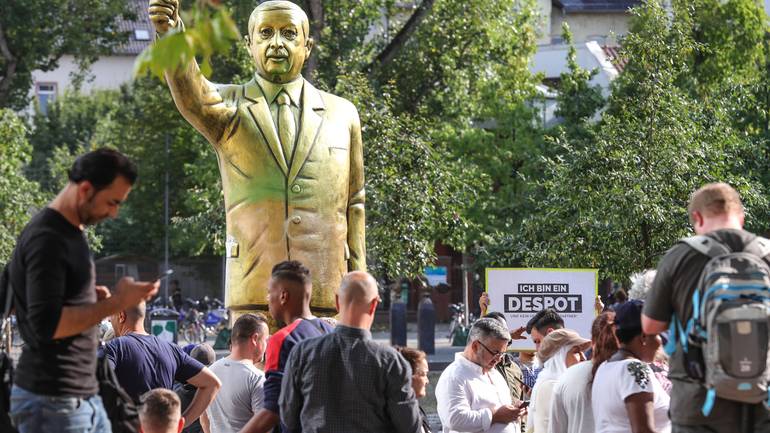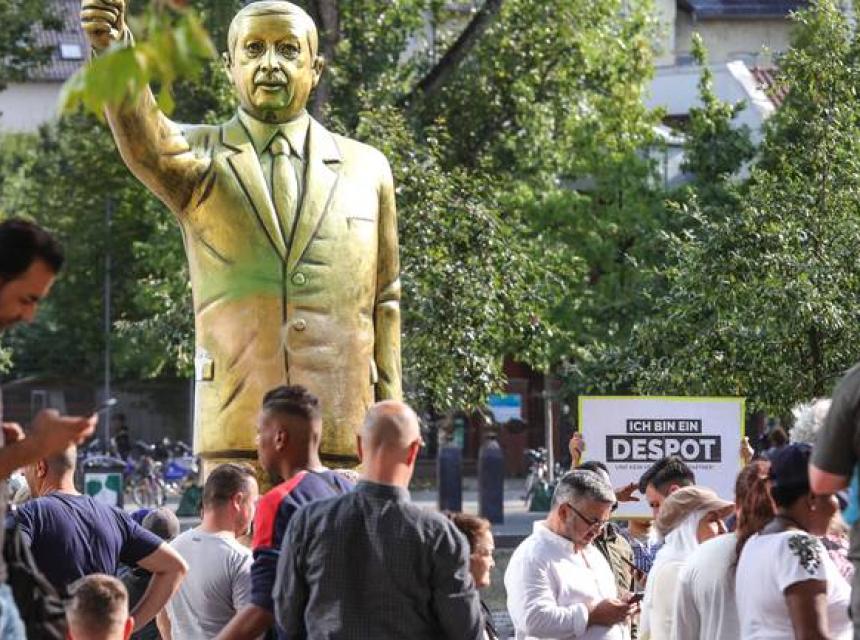 Turski predsjednik je prikazan s podignutom desnom rukom, slično kipu Sadama, koji je oborila američka vojska 2003. godine, tokom invazije na Irak.