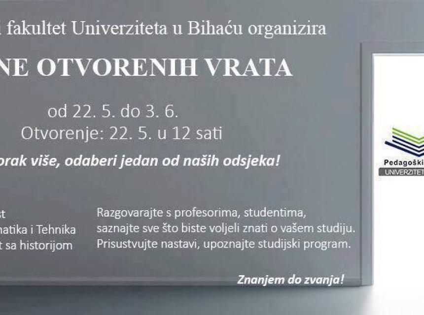 Pedagoški fakultet Univerziteta u Bihaću od 22.05. do 03.06. organizuje DANE OTVORENIH VRATA za sve zainteresirane buduće studente koji još razmišljaju o svom daljem obrazovanju.