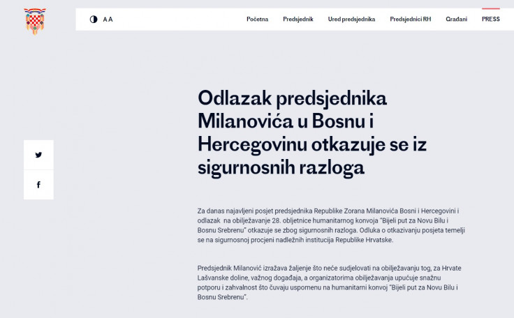 - Za danas najavljeni posjet predsjednika Republike Zorana Milanovića Bosni i Hercegovini i odlazak na obilježavanje 28. obljetnice humanitarnog konvoja “Bijeli put za Novu Bilu i Bosnu Srebrenu” otkazuje se zbog sigurnosnih razloga. Odluka o otkazivanju posjeta temelji se na sigurnosnoj procjeni nadležnih institucija Republike Hrvatske.