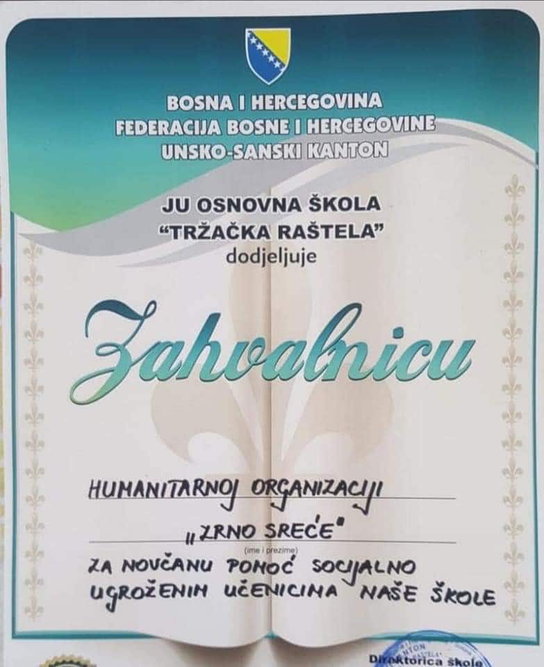 'Zrno sreće', humanitarna organizacija naših ljudi iz Švicarske koji pomažu siromašnima i bolesnima u Bosni i Hercegovini, uspješno je realizirala još jednu humanitarnu akciju. Donacija je ovaj put bila namijenjena za učenike osnovne škole u Tržačkim Raštelima - Cazin.