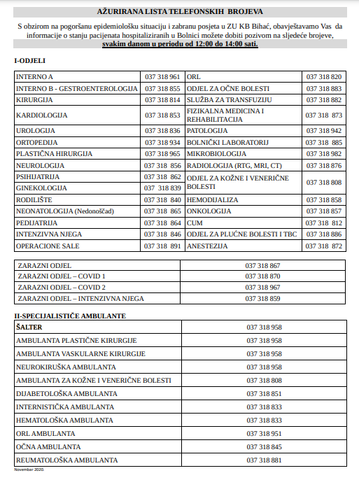 Obzirom na pogoršanu epidenmiološku situaciju i zabranu posjeta u ZU Kantonalna bolnica „Dr. Irfan Ljubijankić“, informacije o stanju pacijenata hospitaliziranih u KB se mogu dobiti pozivom na navedene brojeve svakim radnim danom od 12:00- 14:00 sati.
