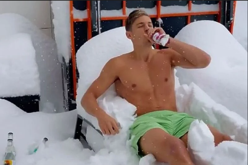 Dvadesetpetogodišnji veznjak je u kupaćim gaćicama izašao u vrt svoje kuće i legao je na ležaljku punu snijega kao da se sunča, pijući tom prilikom novo bezalkoholno piće koje promovira.