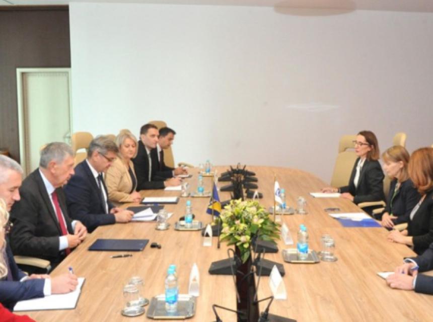 Predsjedavajući i dopredsjedavajući Predstavničkog doma Parlamentarne skupštine Bosne i Hercegovine (PSBiH) Denis Zvizdić te Nebojša Radmanović i Borjana Krišto razgovarali su danas u Sarajevu sa šeficom Misije OSCE-a u BiH Kathleen Kavalec o velikom broju pitanja u kojima se realizira saradnja između BiH i OSCE-a.