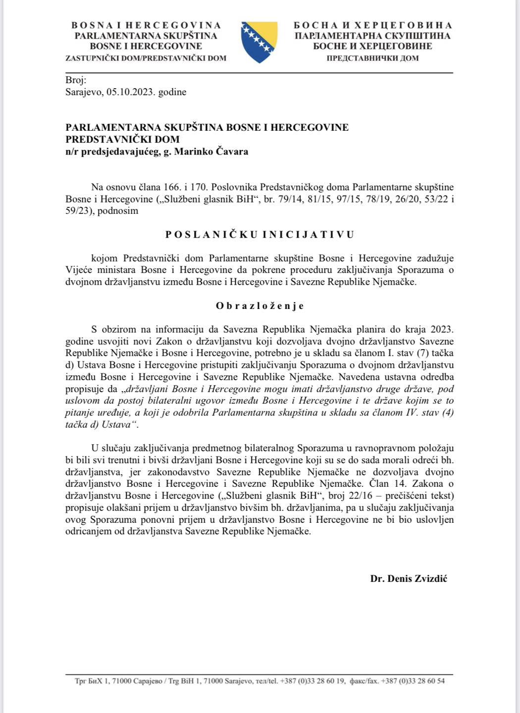 Zamjenik predsjedavajućeg Predstavničkog doma Parlamentarne skupštine Bosne i Hercegovine Denis Zvizdić uputio je danas poslaničku inicijativu kojom traži pokretanje procedure zaključenja Sporazuma o dvojnom državljanstvu između BiH i Njemačke.