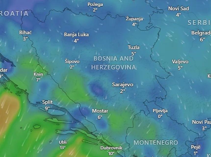 Vjetar u većem dijelu Bosne slab do umjerene jačine sjevernog smjera. U Hercegovini, zapadu i jugozapadu Bosne jak vjetar sjevernog smjera. Temperatura zraka većinom između 2 i 7 stepeni, na jugu zemlje od 7 do 12 stepeni celzija.